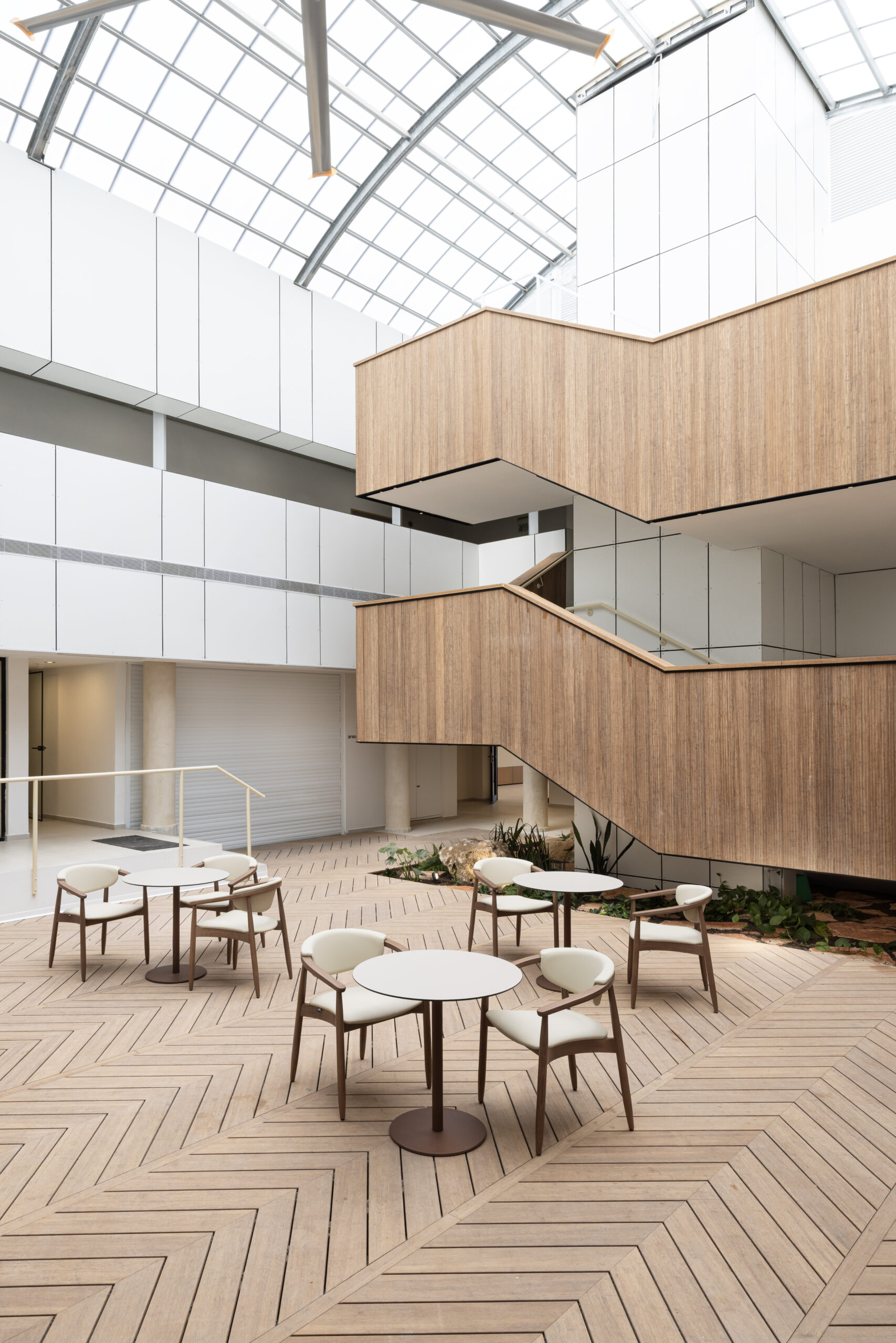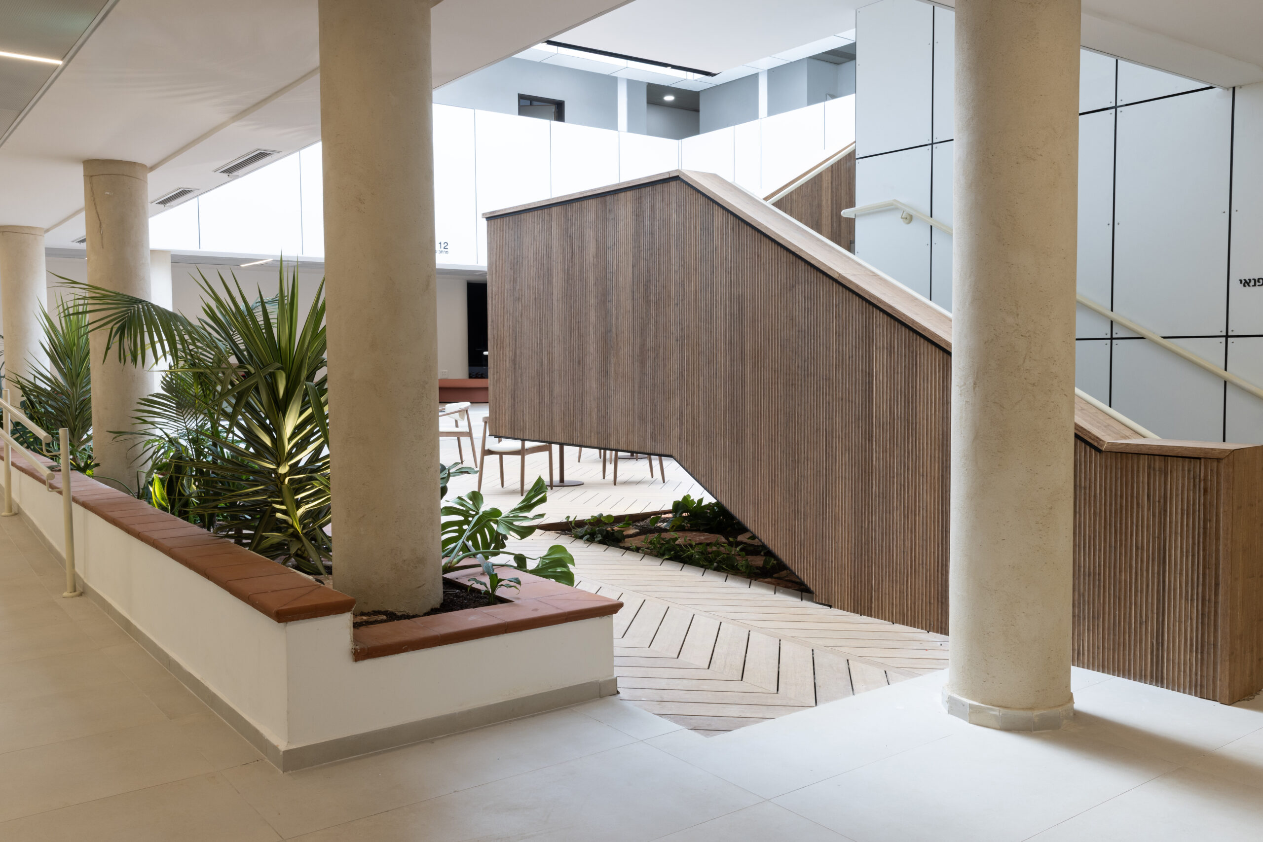 חיפוי קיר למדרגות אולטרה דנסיטי, ריצוף דק במבוק סוואנה בהתקנת פישבון בחלל המרכזי וקופינג לוחות במבוק גושני סוואנה