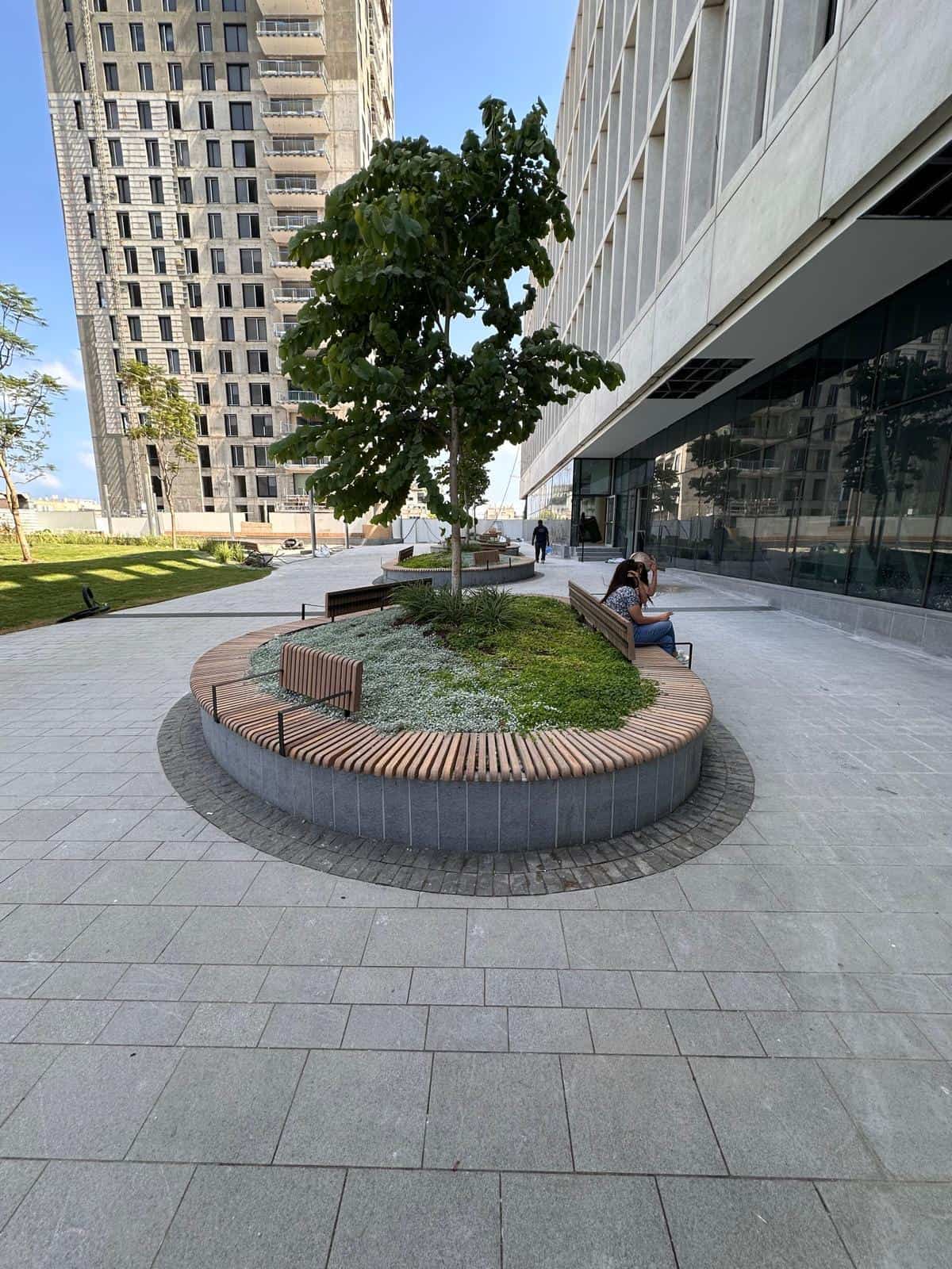 ספסל מתפתל מיחידות N-durance שהוזמן במידה מיוחדת עבור הפרויקט באיזורים מסויימים עם תוספת משענת גב וידיות
