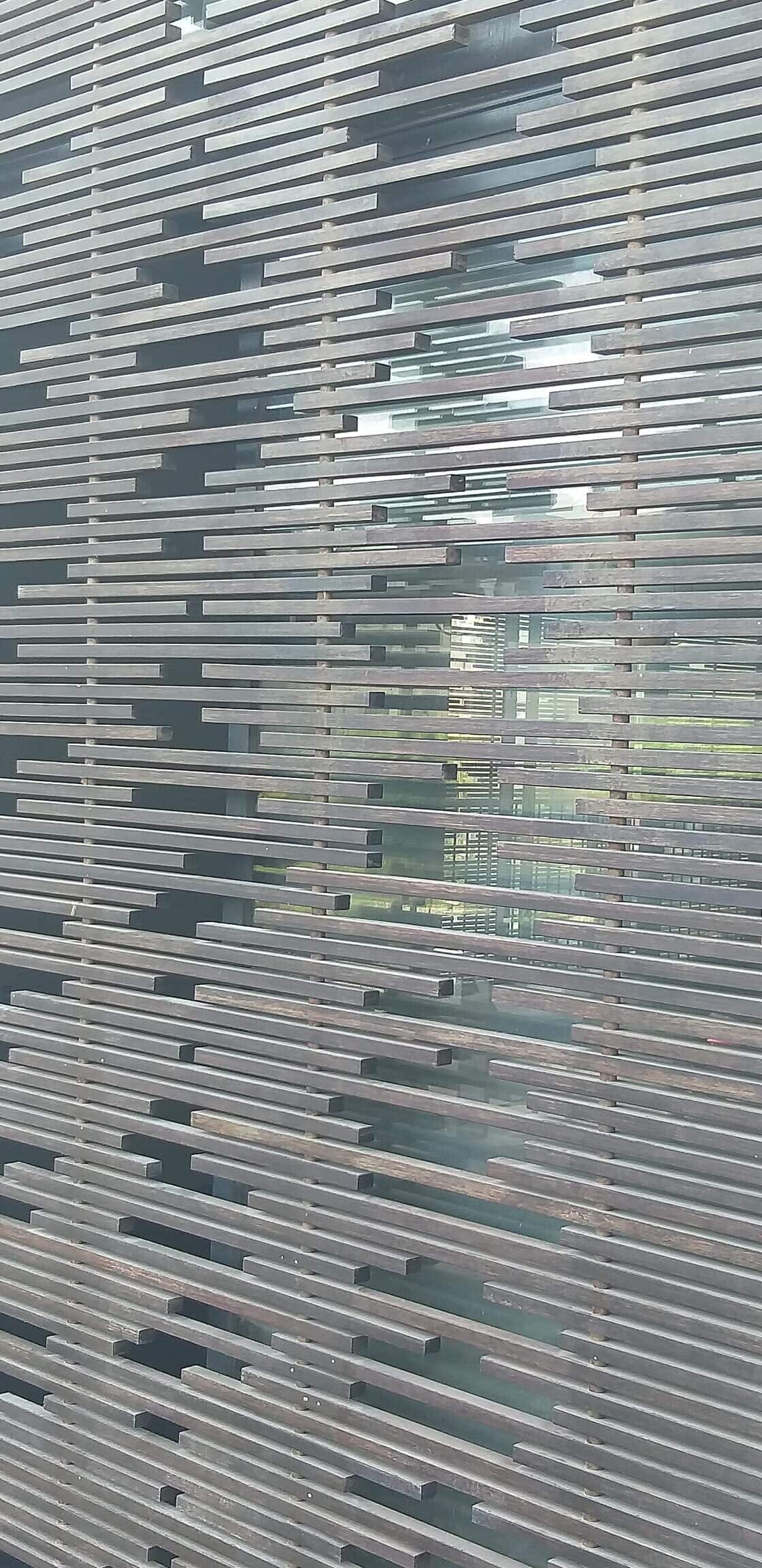 במעטפת הבניין סבכות במבוק כחלק מחיפוי הקירות על גג המבנה רחבת דק במבוק עם בריכת שחיה המשקיפה על העיר